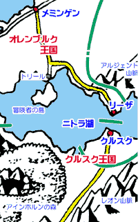 メミンゲンから8日ほど南下し、大陸最大の湖、ニトラ湖の近くに来たところで、“冒険者の島”への港町トリール方面と、クルスク王国への港町リーザ方面への分岐に差しかかった。